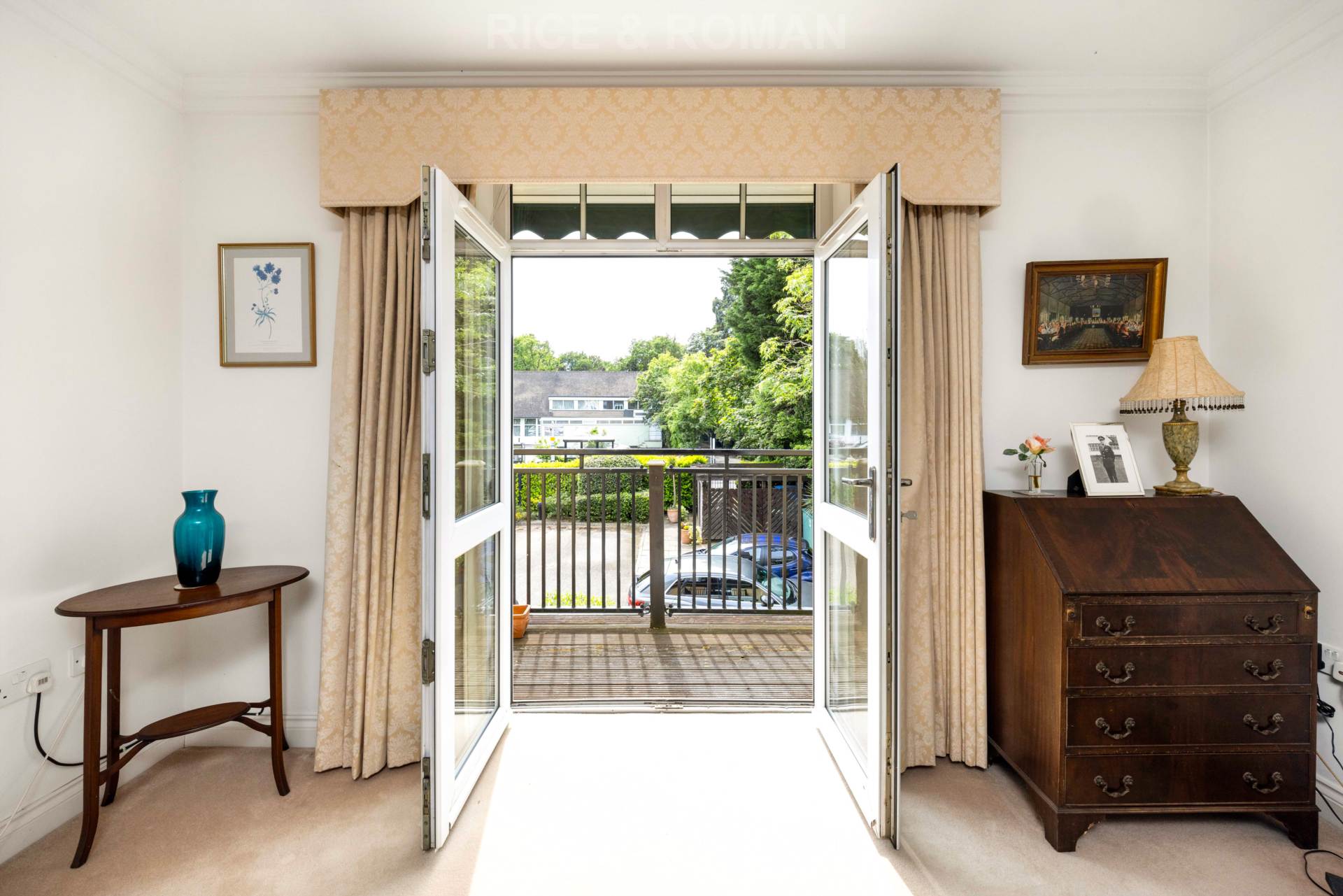 This well presented apartment has a large reception room with built in fireplace and french doors leading out onto the private balcony, modern kitchen with a window and sufficient space for a small dining table, a spacious master bedroom with built in wardrobes and en-suite bathroom, second bedroom with en-suite and a larger than average hallway which the current owners use as a dining area, and two storage cupboards off the entrance hall, plus additional WC.